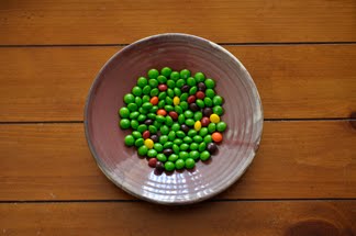 After all the leftovers are back on stage the audience having just started to work up a sugar high demands an encore! Not wanting to disappoint them I break open some new bags of skittles filling back up the bowl and start the process over again. However realizing that many people in the rows further back never got any candy the first time I allow them to pass on the candy 50 times. This time if no one eats it I ask them to toss the leftovers toward the lobby entrance in the rear of the auditorium. This time the candy left here makes up diffuse transmission. There is a lot less candy than what we started with (hence even greater loss of light) and a very large proportion of green Skittles (giving the appearance of a very high chroma green)